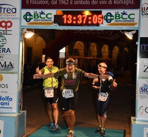 Solo oggi riesco a realizzare e a metabolizzare quello che ho fatto in questo weekend perchè, per tutto ieri, ho vissuto a tre metri da terra in uno stato di gioia totale che mi ha permesso di non toccare il letto per 43 ore senza aver nessun problema !!! Questa gara, a parte le mie motivazioni personali, è un viaggio meraviglioso fra due regioni dove conosci tantissime persone e ognuna di queste, con il suo modo di fare, ti fa capire quanto stai bene in mezzo a loro !!! Per tre anni ho preso il pullman dei ritirati da Borgo San Lorenzo a Faenza ed arrivavo lì vedendo tutta la gente con la medaglia al collo e le tre bottiglie di vino canoniche in mano e non ho mai provato invidia ma solo tanta rabbia perchè sapevo che, fisicamente, io ce l’avevo dentro questa corsa ma non riuscivo a tirarla fuori !!! Il primo anno, con il mio amico Gaetano Geraci ero partito già infortunato da Genova (bandelletta ginocchio sx) e ci ho provato ma il dolore era più forte di me ed ha vinto lui !!!