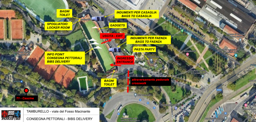 In Viale del Fosso Macinante (Tamburello presso il Club Sportivo Firenze) a Firenze viene allestito il Villaggio del Podista dove sono presenti gli stand dell’Organizzazione in cui è possibile ritirare il pettorale previa presentazione delle mail di conferma iscrizione e di un documento di riconoscimento. Questo è anche il luogo di arrivo dei pullman (concorrenti, bici e indumenti) partiti da Faenza. Sono presenti anche bagni chimici ed è possibile consumare, previa prenotazione, il pasta party.
